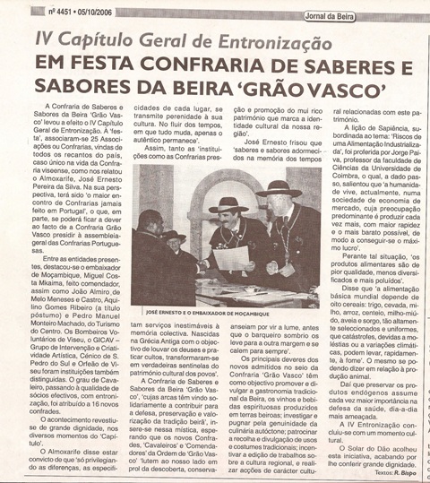 Realizou-se no passado dia 21 de Abril de 2006, na Casa dos Gomes em S. João de Lourosa, o aniversário da Confraria e entrega dos Beirões de Mérito. Foi orador Dr. Armando Fernandes, investigador e consultor cultural, Vice Presidente da Federação das Confrarias Portuguesas, o tema " O QUE COMEMOS ".
